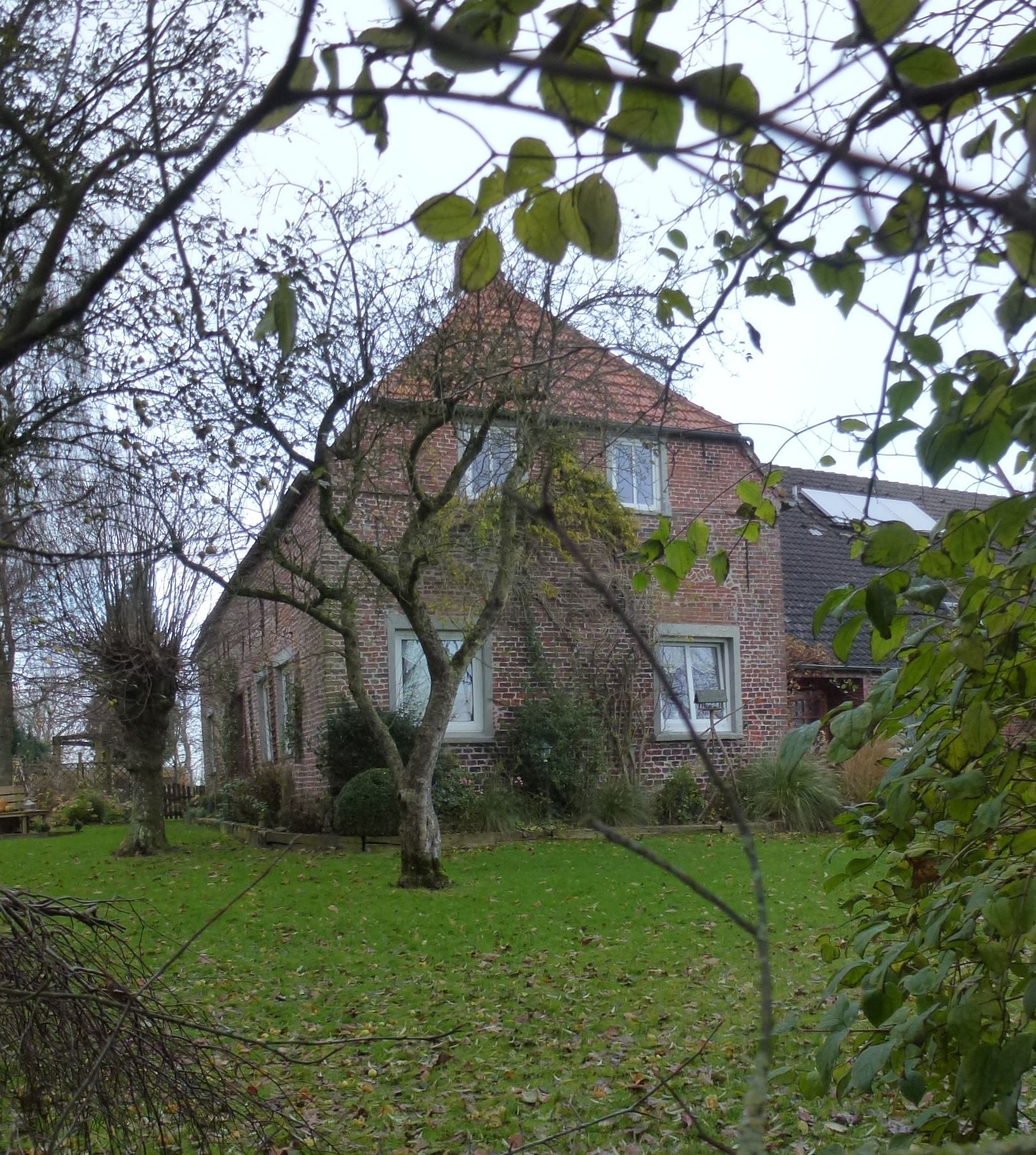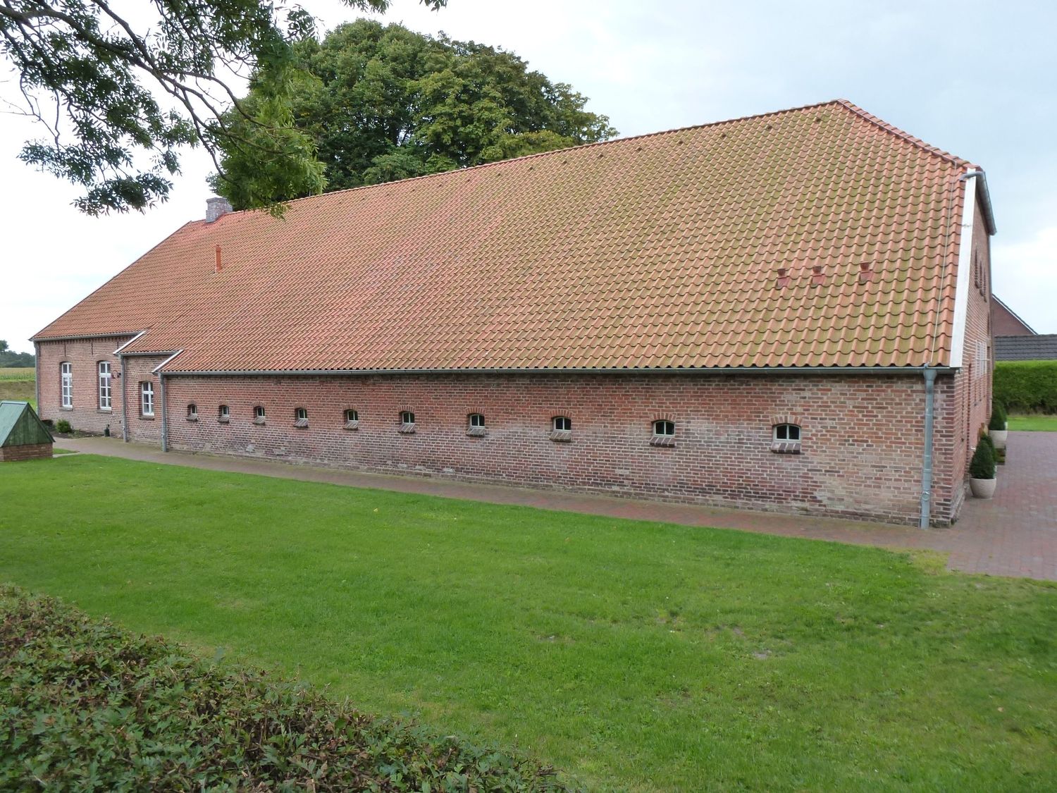- Das Niederdeutsche Hallenhaus ist traditionell ein Fachwerkhaus mit Reetdach. Je nach Größe ist es als Zwei-, Drei- oder Vierständerbau konstruiert, d. h. der Dachstuhl ruht auf zwei, drei oder vier Reihen senkrechter Ständer. Seit dem 19. Jh. wird das Hallenhaus meist aus Bruch- oder Ziegelstein gemauert und mit Dachpfannen gedeckt. Charakteristisch ist ein imposanter Giebel mit einer großen, mehr oder weniger mittigen und mit einem Wagen durchfahrbaren Dielentür. Wohn- und Wirtschaftsbereich liegen unter einem Dach, die Ernte lagert auf dem Dachboden. Kleine Exemplare sind das Heuerlingshaus, der Kotten oder die Kate sowie das Altenteil als Altersruhesitz.