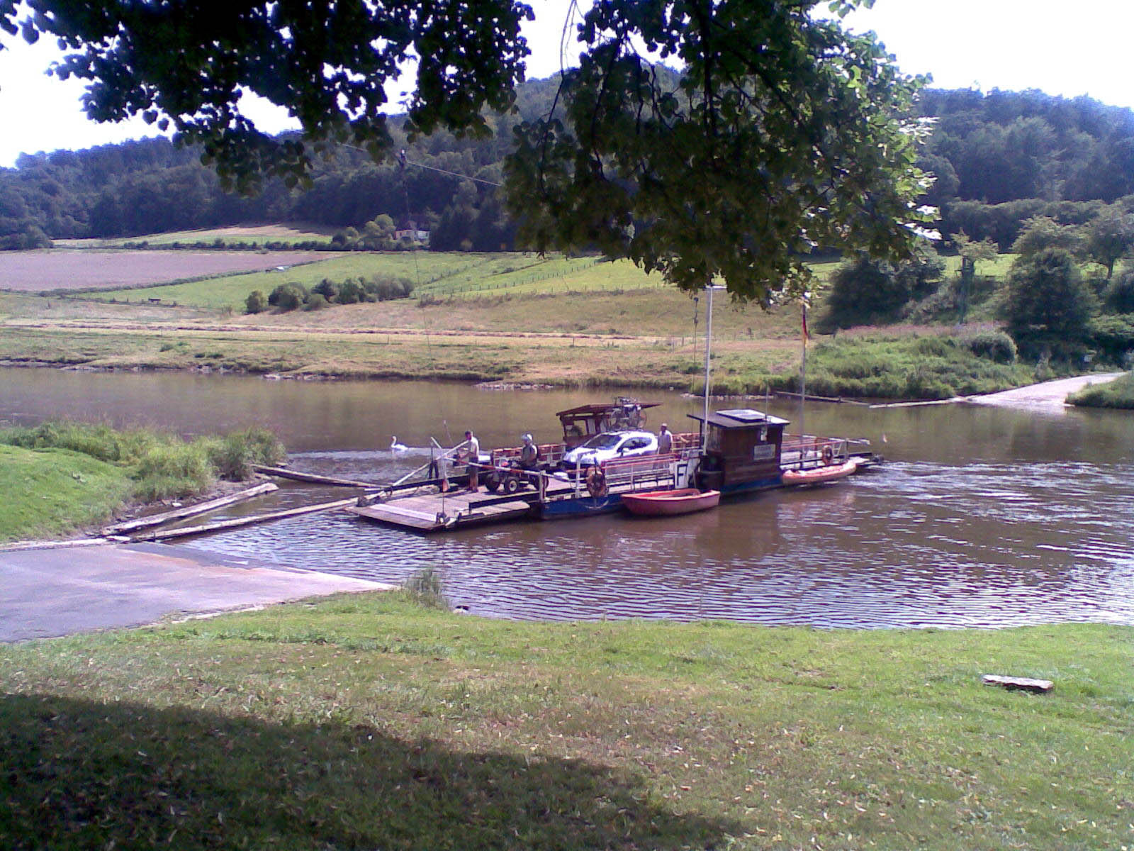 Schwimmende Verbindung zum Überqueren eines Flusses. Dauerhafte Fähreinrichtungen in der Landschaft sind Anlegestellen (flach ins Wasser auslaufende Wege) und Fährhäuser. Je nach Antriebsart unterscheidet man Motorfähren und Fähren, die gesegelt, gerudert oder an einem Drahtseil befestigt mit Hilfe der Strömung (Kabel-, Schwebe- oder Gierfähren) den Fluss überqueren.