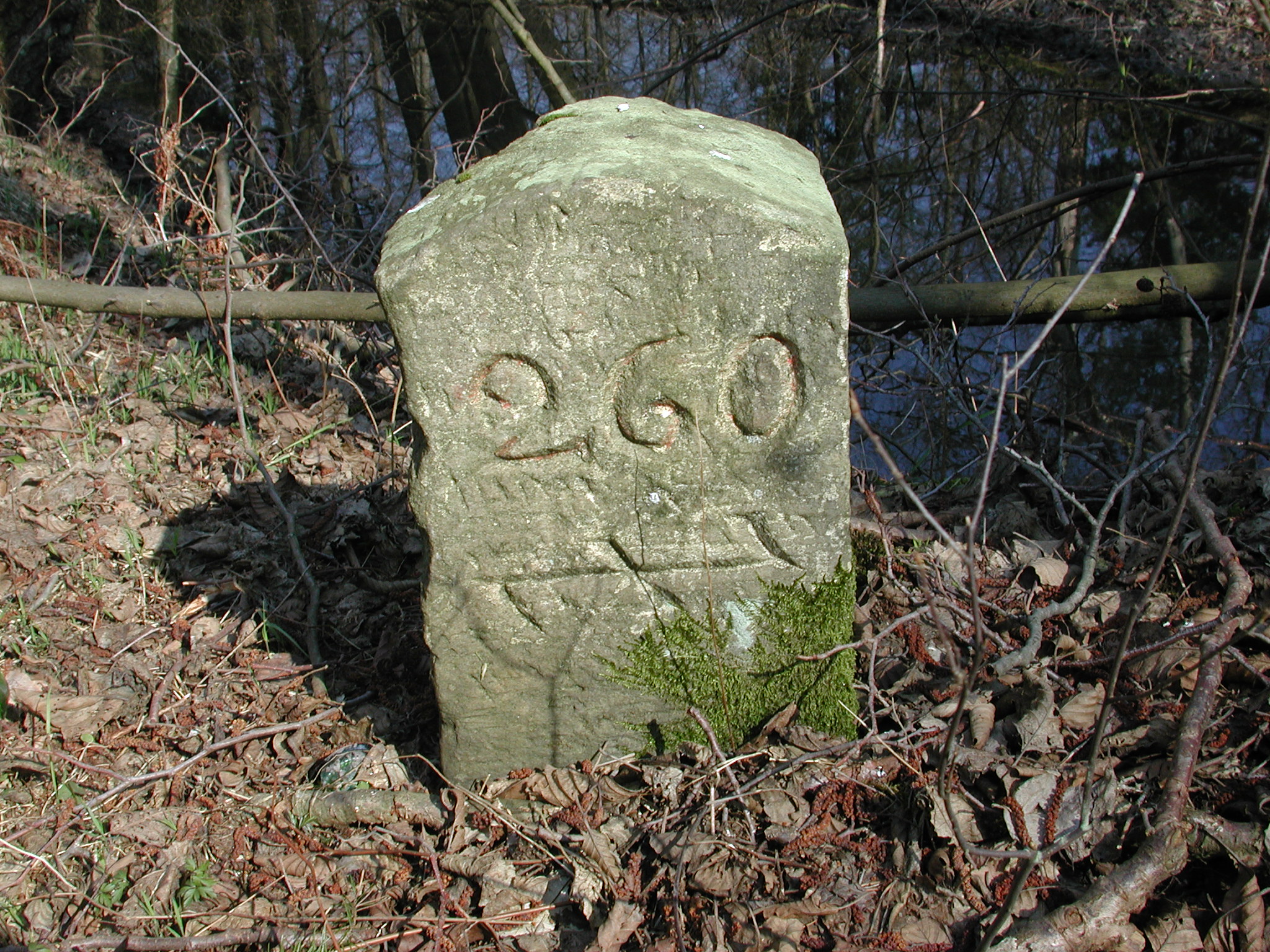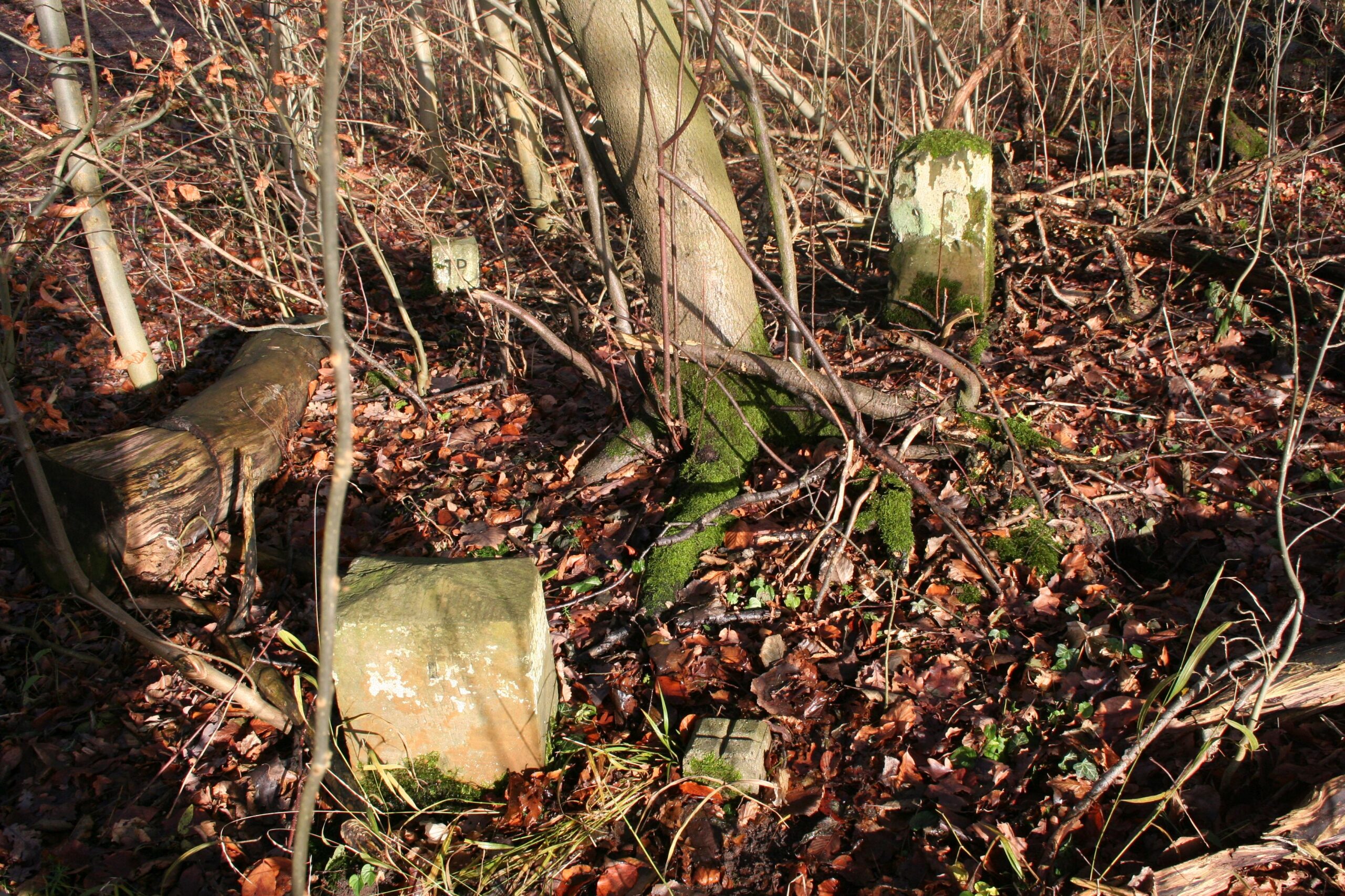 Historische Grenzsteine sind vielerorts noch erhalten, können aber im Unterholz oder unter Erde versteckt und dadurch schwer zu entdecken sein.