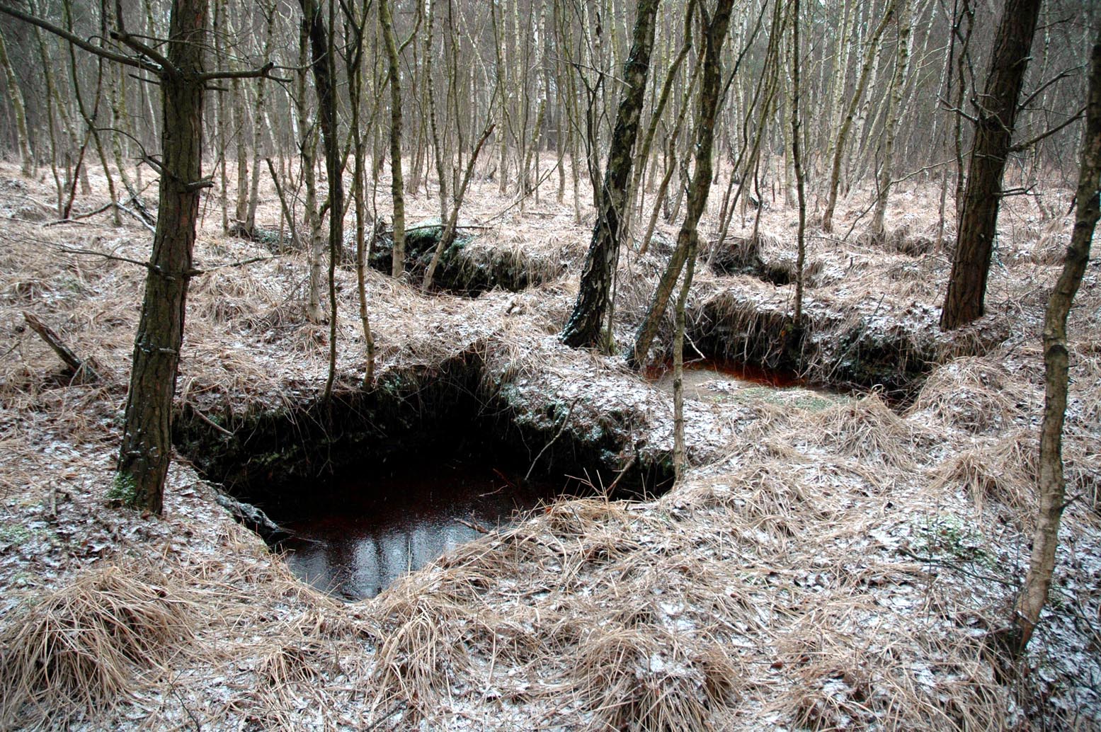 Längliche, max. 2 m tiefe, i. d. R. mit Wasser vollgelaufene eckige Gruben (Pütten) zur Gewinnung von Schwarztorf durch Handabbau (siehe Abb. Kap. 1.3.5). Oft sind die Pütten durch Wege erschlossen und liegen im Abstand von 1-2 m parallel nebeneinander.