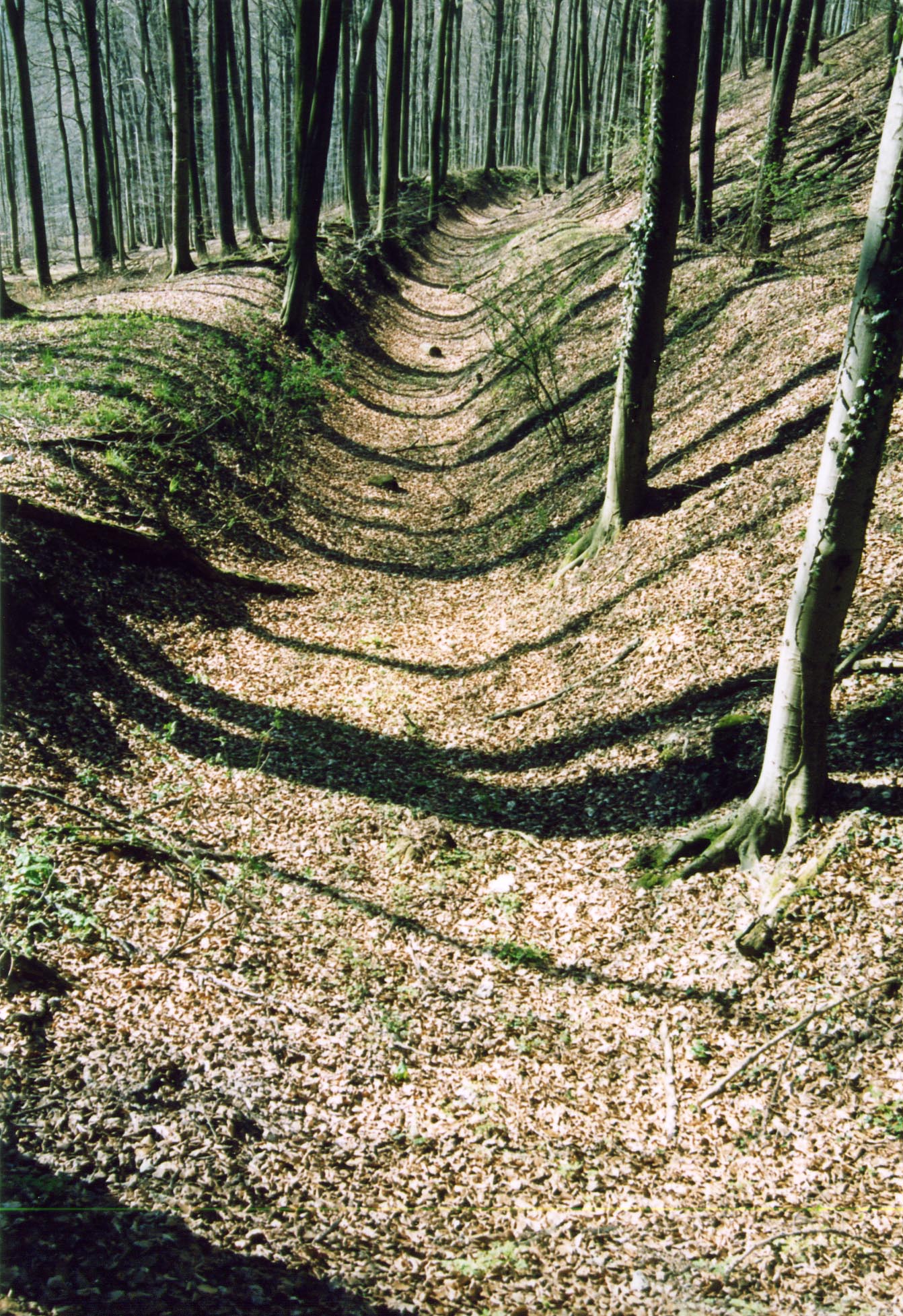 - Hohlweg: eine vertiefte Wegespur, die sich durch fortwährende Benutzung und Erosion v. a. in bergigem Gelände bildet. Die Steilheit und Höhe der Seitenwände hängen ab vom Alter und von der Bindigkeit des Bodens. Hohlwege oder Wegespuren (Wagengeleise) können im parallel verlaufenden Verband auftreten (Hohlwegbündel, Spurenstrang) und sind dann häufig Relikte einer besonders alten Wegeverbindung.